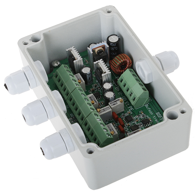 BSFY-1-3三進(jìn)一出傳感器信號電壓放大器,可直接并聯(lián)3個350Ω(或者6個700Ω)應(yīng)變式傳感器,各路傳感器可獨(dú)立修正偏載,整體采用密封式防水鑄鋁外殼防護(hù)等級達(dá)到IP66,內(nèi)部器件均采用原裝進(jìn)口高性能器件,將傳感器的輸出信號進(jìn)行精密放大,線路內(nèi)部進(jìn)行穩(wěn)壓,恒壓供橋、阻抗適配,線性補(bǔ)償,溫度補(bǔ)償?shù)龋瑢⒘W(xué)量轉(zhuǎn)換成標(biāo)準(zhǔn)電壓信號輸出:0~1.65V,0~3.3V,0~5V,0~10V,0±1.65V,0±3.3V,0±5V,0±10V,1.65±1.65V,2.5±2.5V,5±5V后,直接與自動控制設(shè)備(單片機(jī)、PLC、巡檢儀等)接口或與計算機(jī)聯(lián)網(wǎng),具備標(biāo)準(zhǔn)信號外調(diào)零、外調(diào)增益功能,輸入過壓保護(hù),輸出短路保護(hù)等功能。